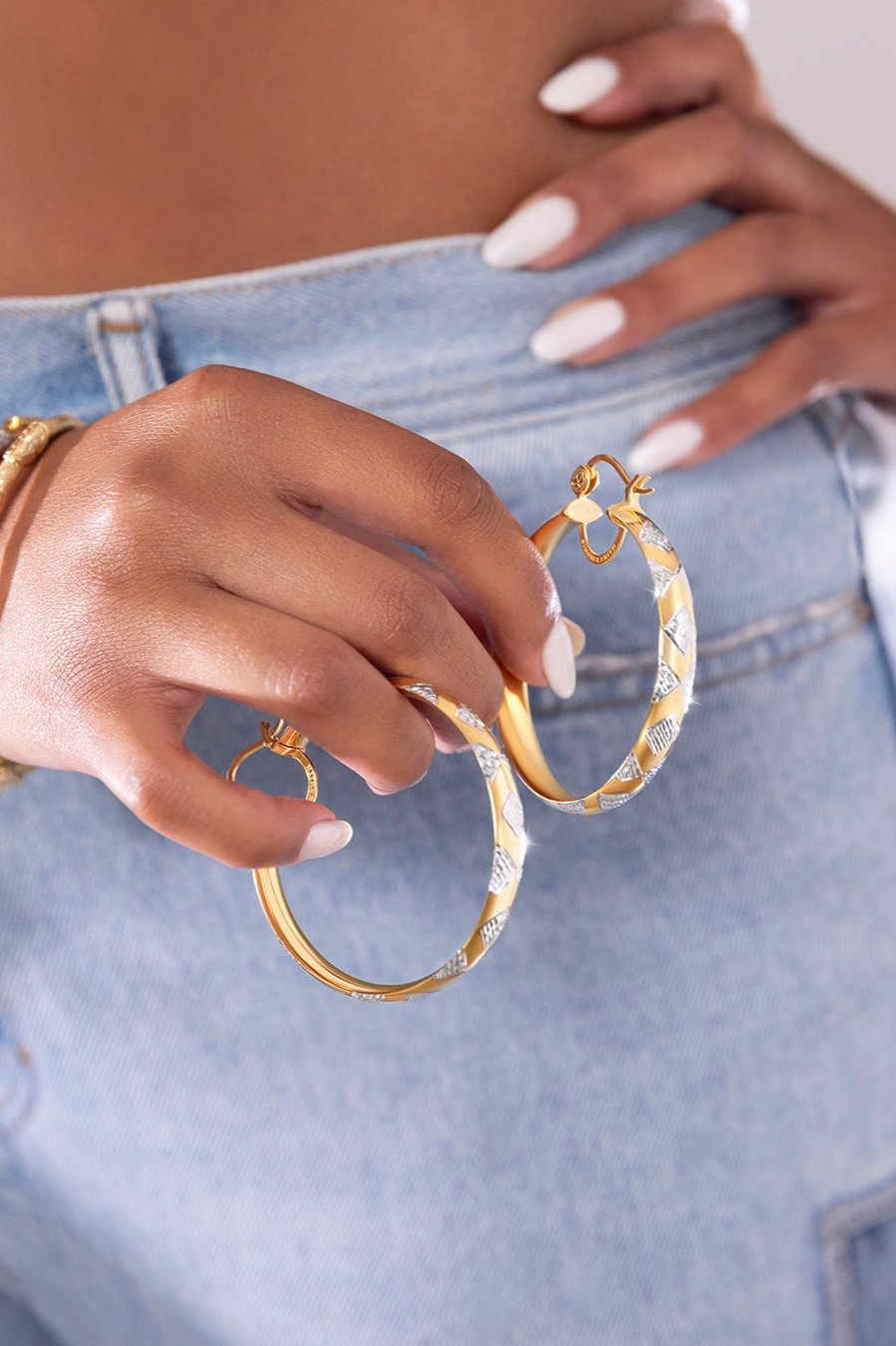 18K Yellow Gold & Platinum Over Sterling Silver Diamond Cut and High Polished Bold "Like A Diamond" Hoop Size Large