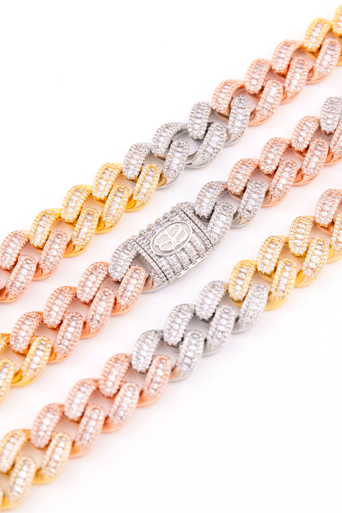 Domed Miami Link Bracelet Adorned with Brilliant Simulated Baguette Round Diamonds, Tri Color Gold Tone
