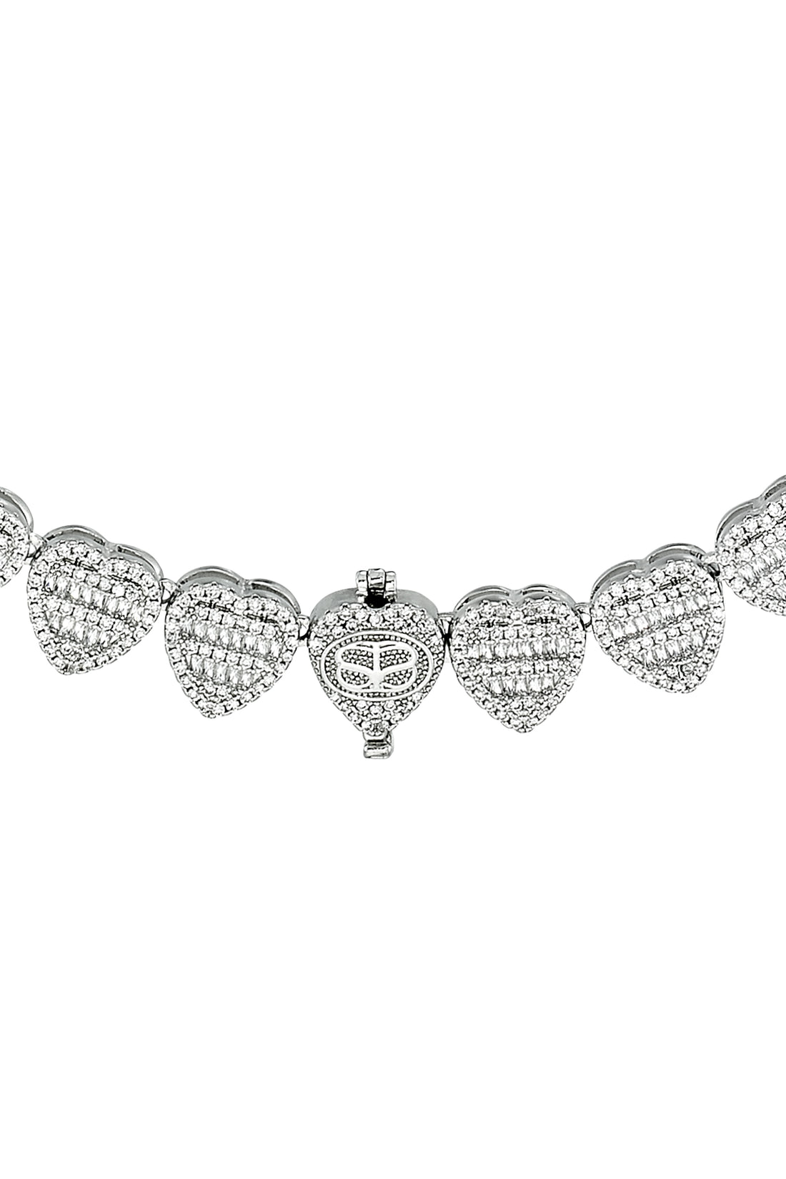 Heart Shape Station Necklace Dripping in Simulated Diamond Baguettes, Platinum Tone