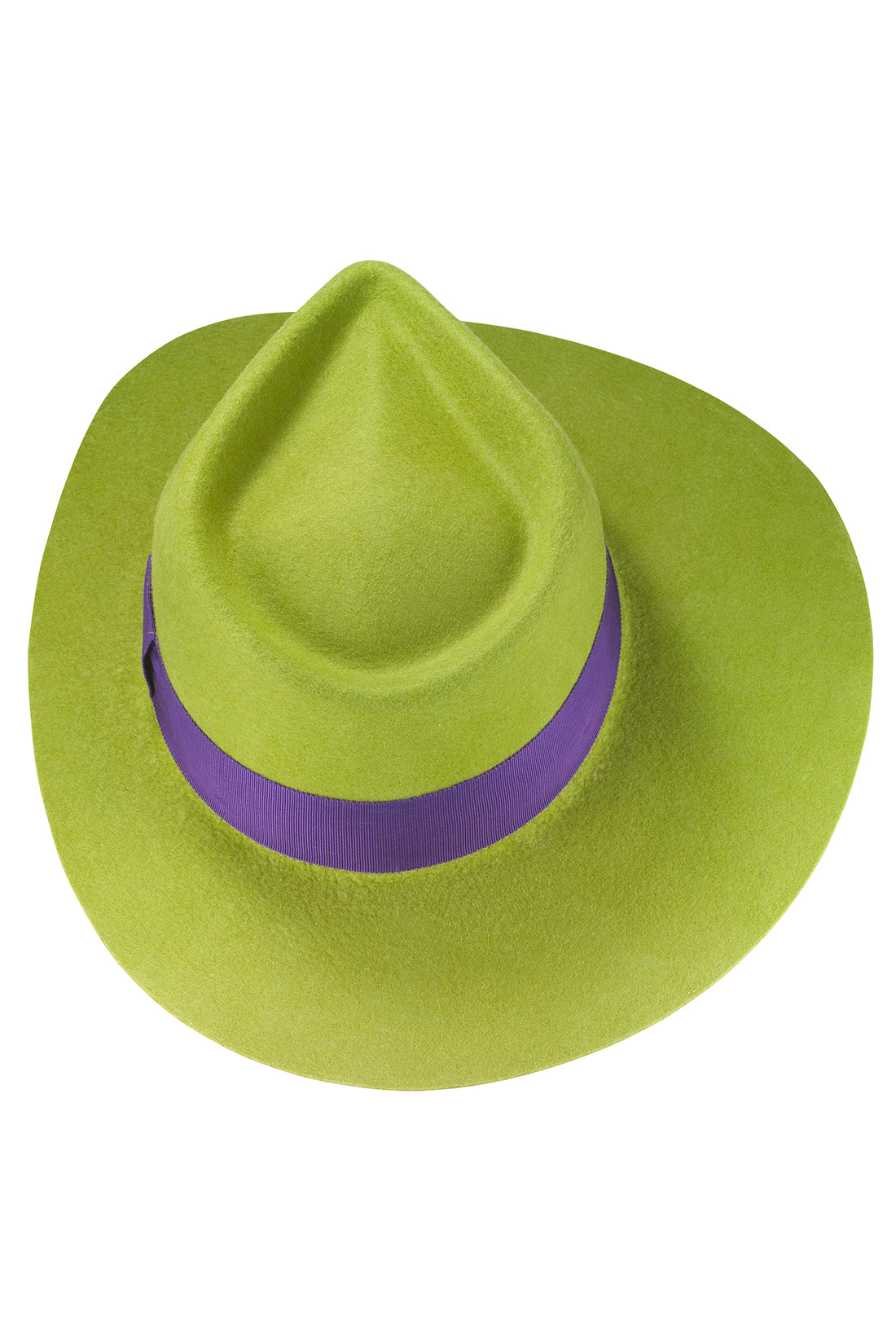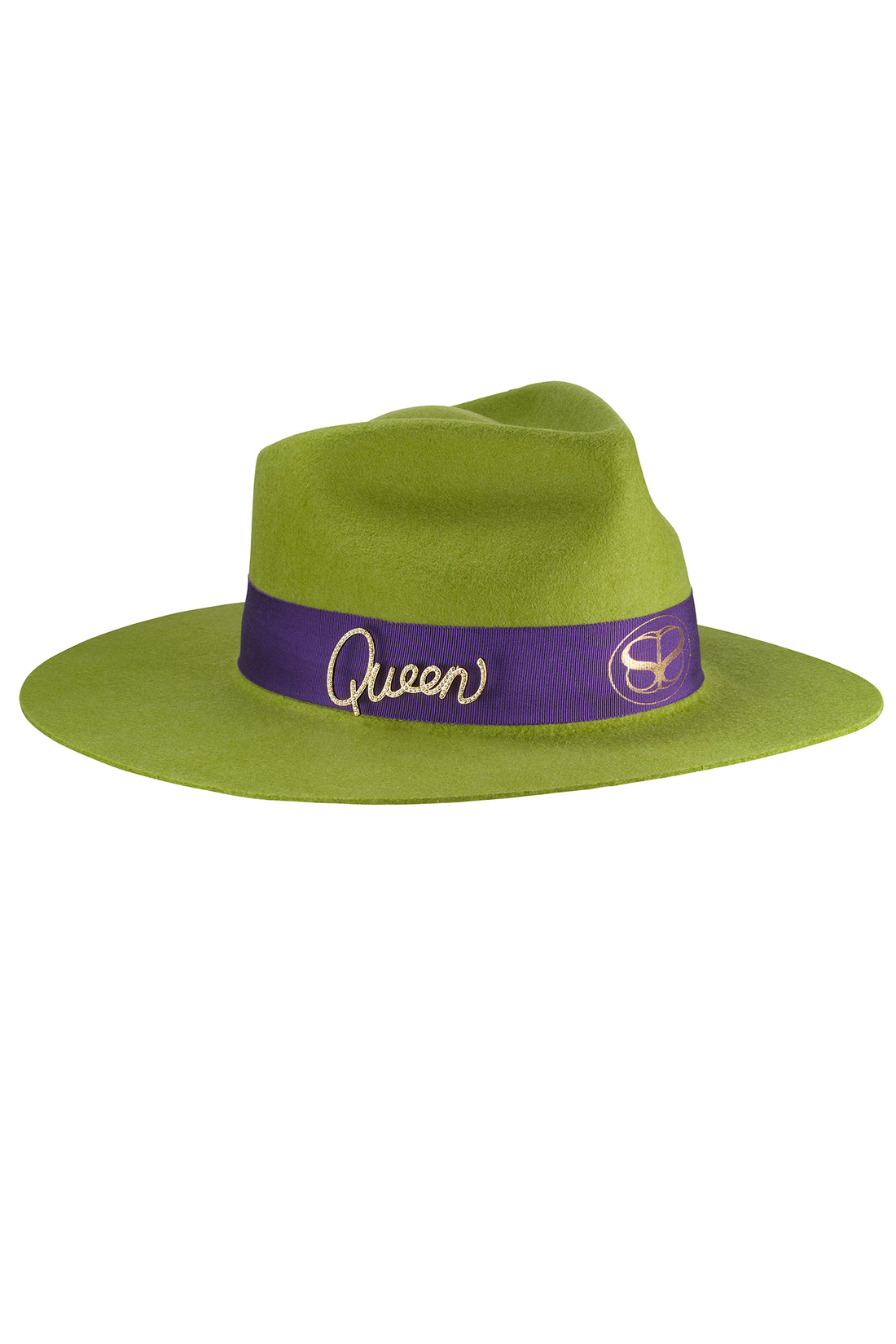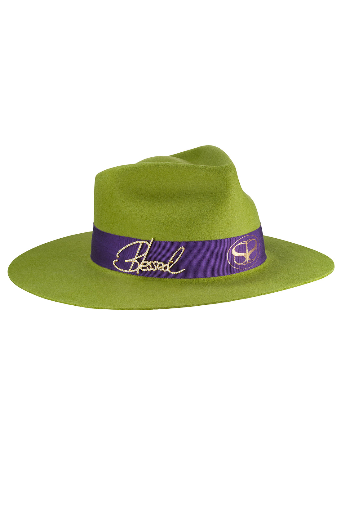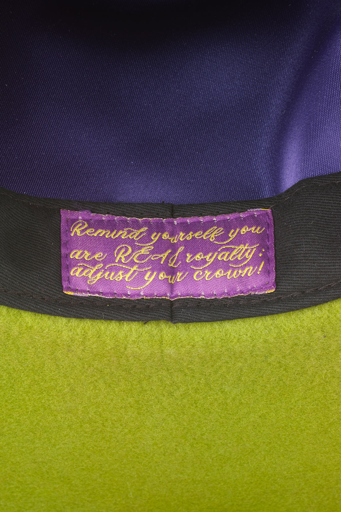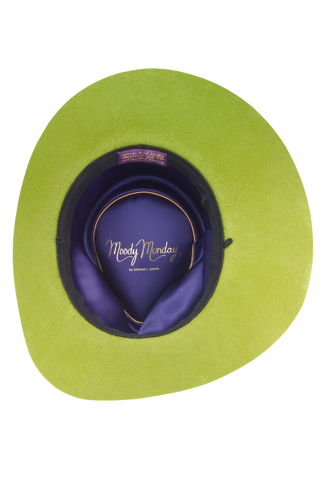 Moody Monday SIS Lime Green Hat. Each hat is handmade from high-quality felt and in versatile shades perfect for all occasions. Special attention was also paid to the inside of the hats, which are lined in silk, feature an inside sweatband and message from Simone to her wearers, “Remind yourself you are real royalty. Adjust your crown." Available in Medium and Large.