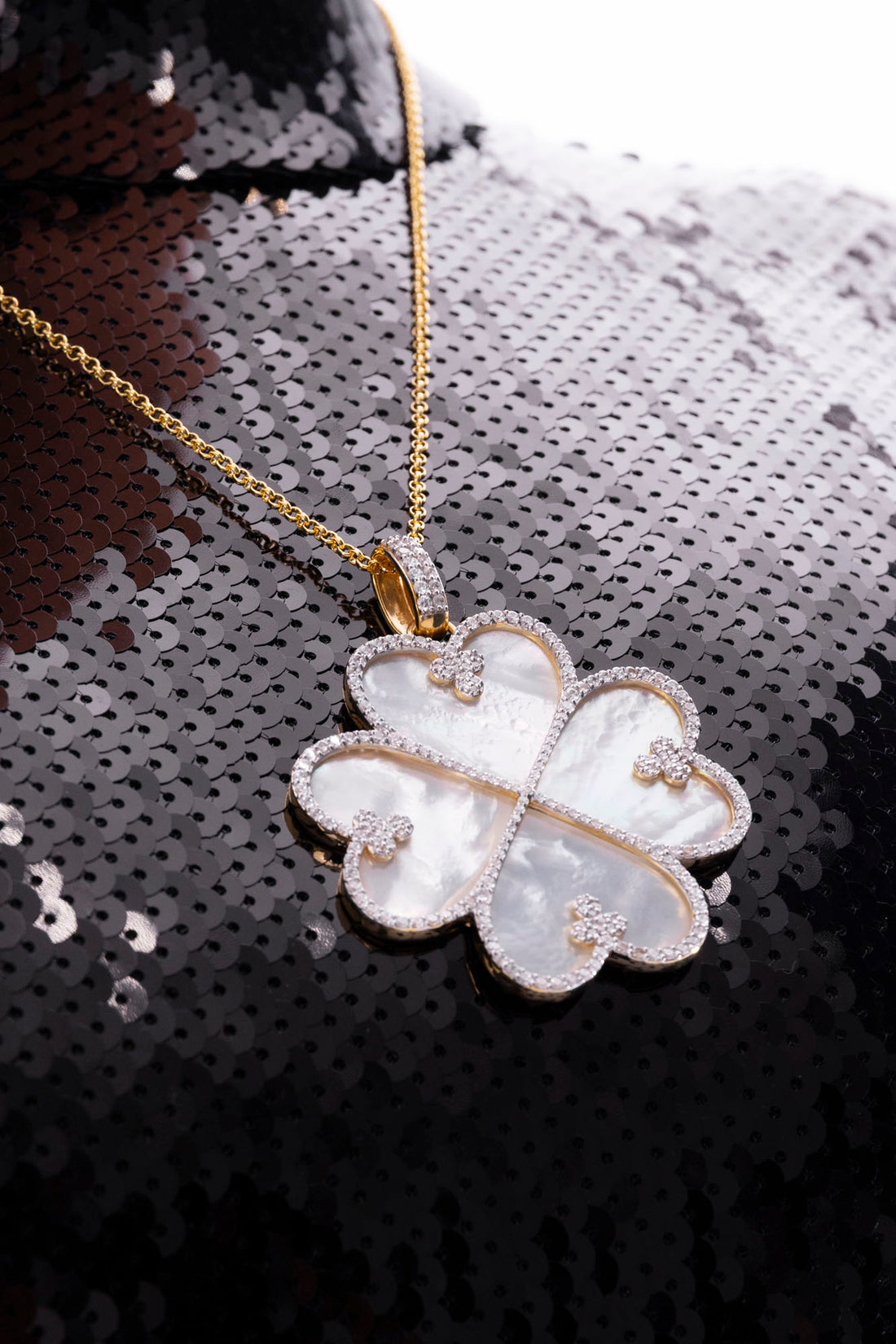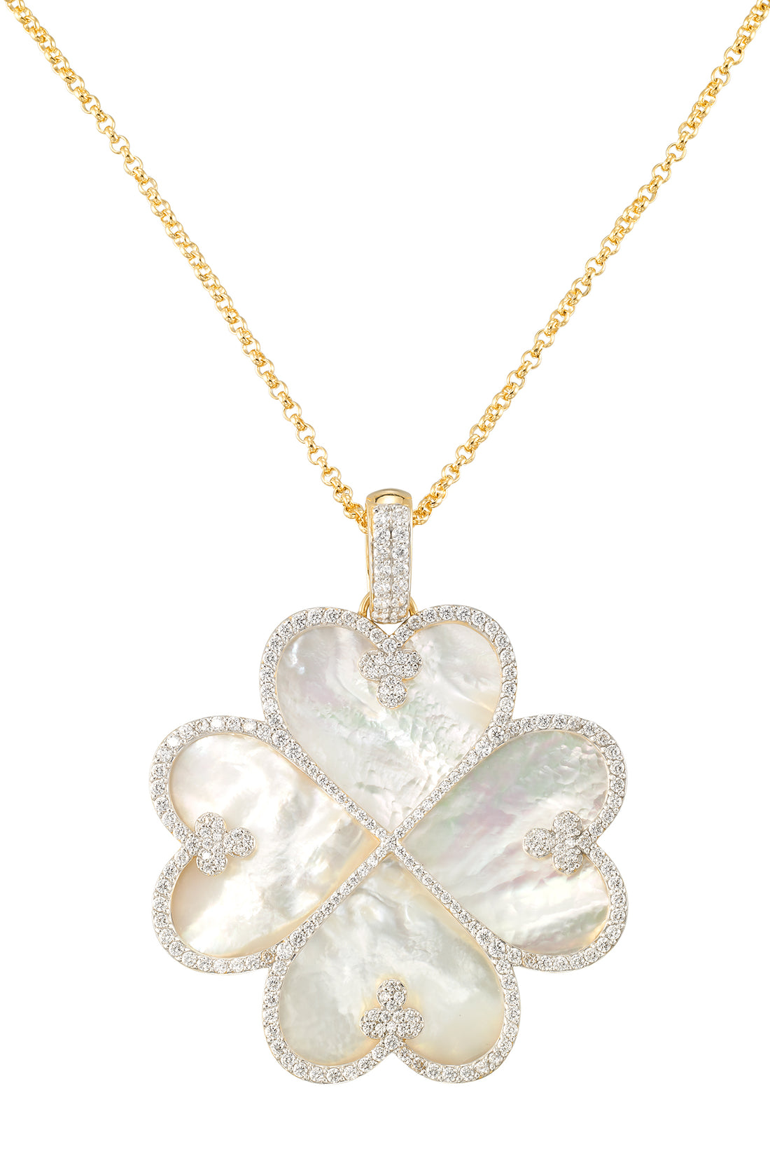 18K Yellow Gold over Sterling Silver with 6.5 CT. T.W. of Brilliant Simulated Diamonds and Carved Mother of Pearl Inlays. 16" Chain with 8" Extender for Personalized Styling.