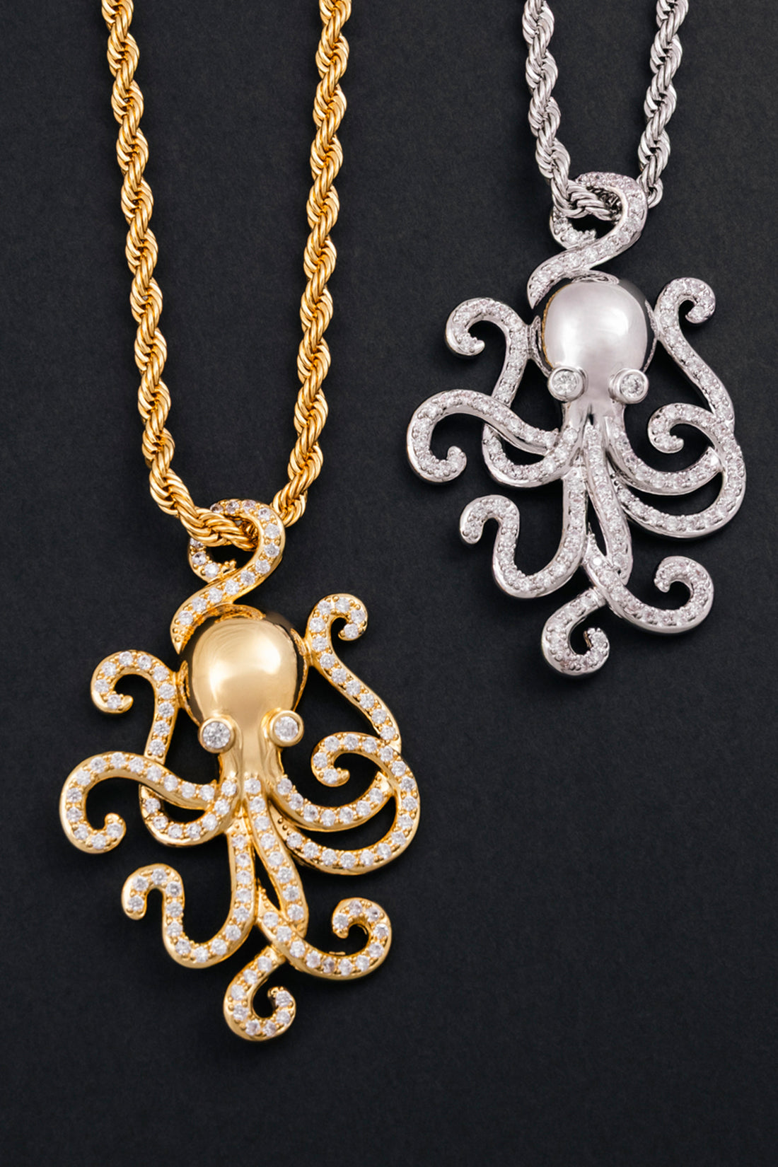 18K Yellow Gold Tone Octopus Pendant with Brilliant Simulated Diamonds. 18" Rope Chain with 3" Extender