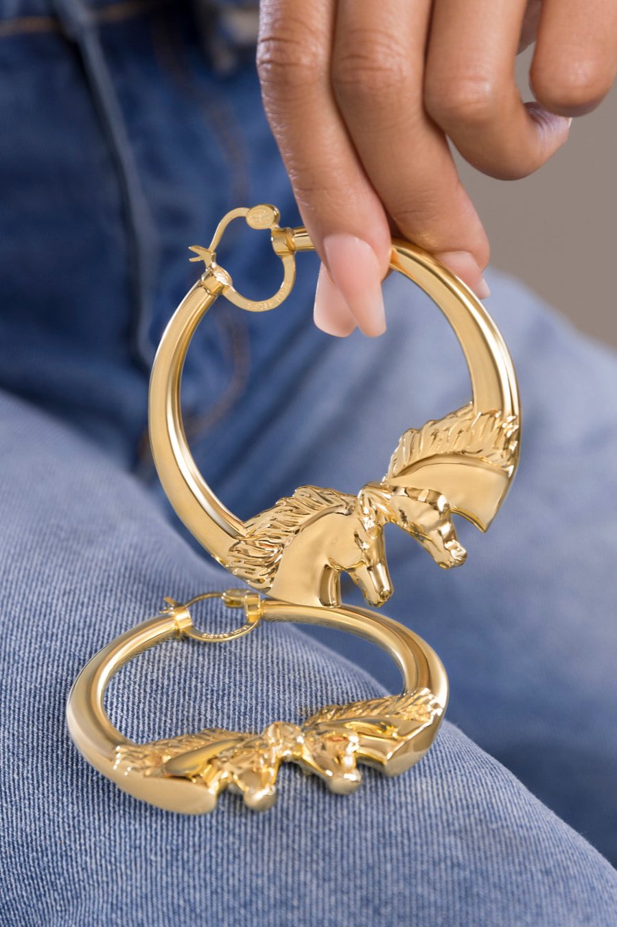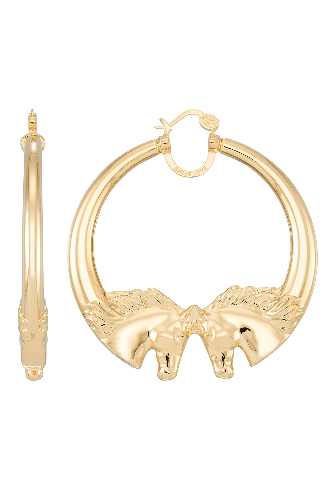 18K Yellow Gold Over Sterling Silver Sister Love The Gold Stallions "Horse" Hoops. Hand Crafted Enamel Infused with a Patented Diamond Resin to Make Earrings Dent Resistant.