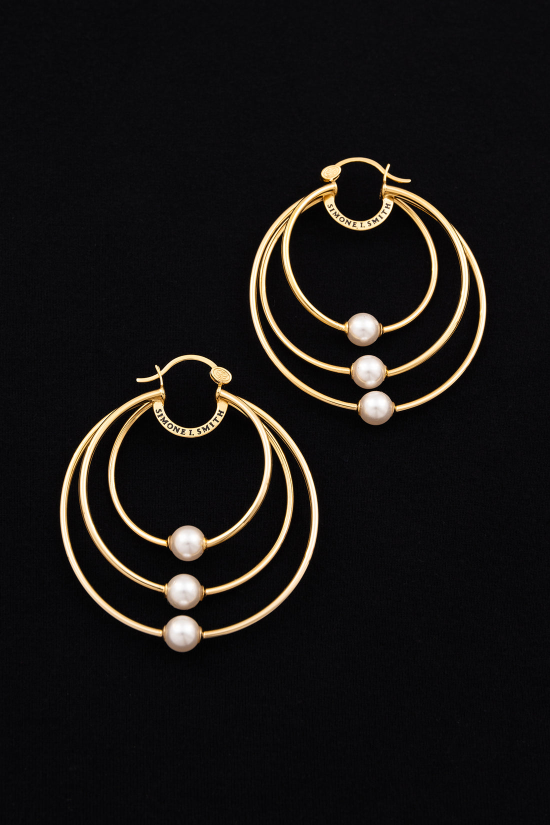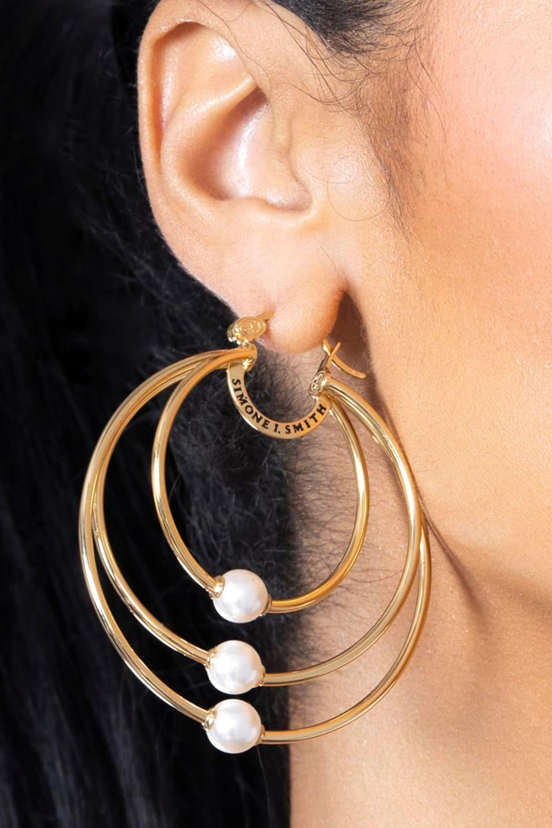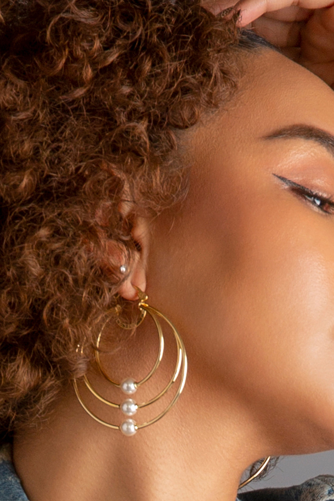 18K Yellow Gold over Sterling Silver Cascading Triple Hoop Earrings with Perfectly Simulated Round Pearls Size: Large, 60mm