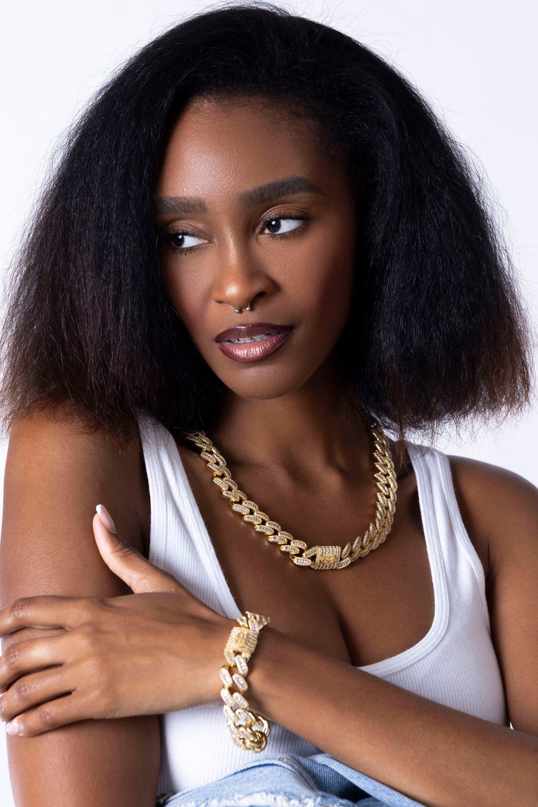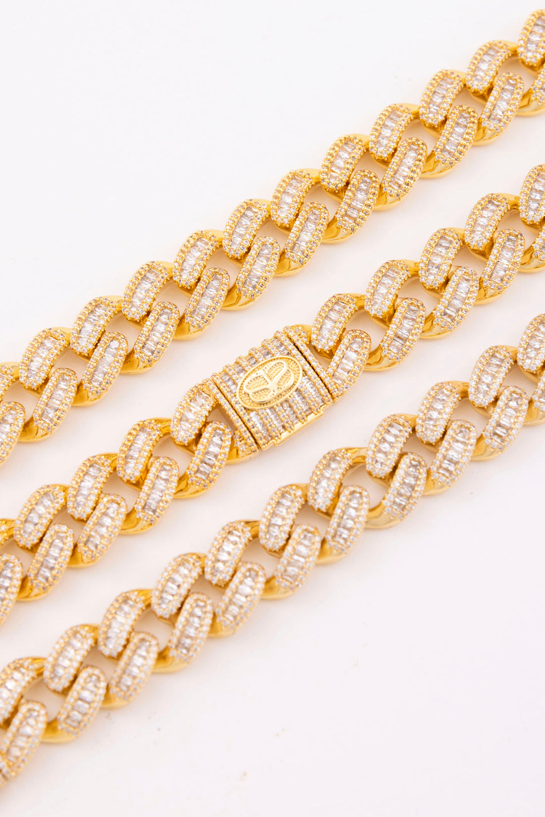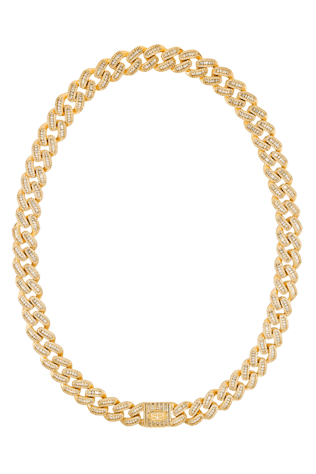 Domed Miami Link Necklace Adorned with Brilliant Simulated Baguette Round Diamonds, Gold Tone